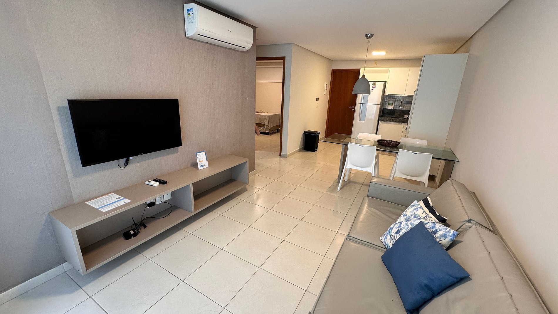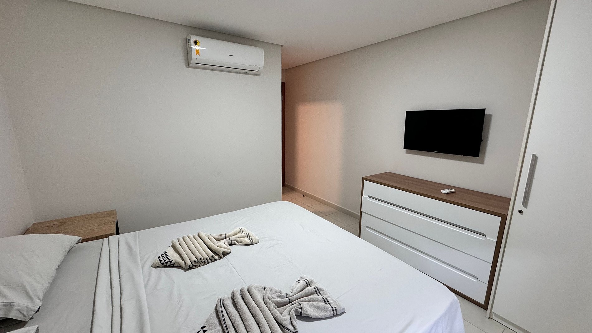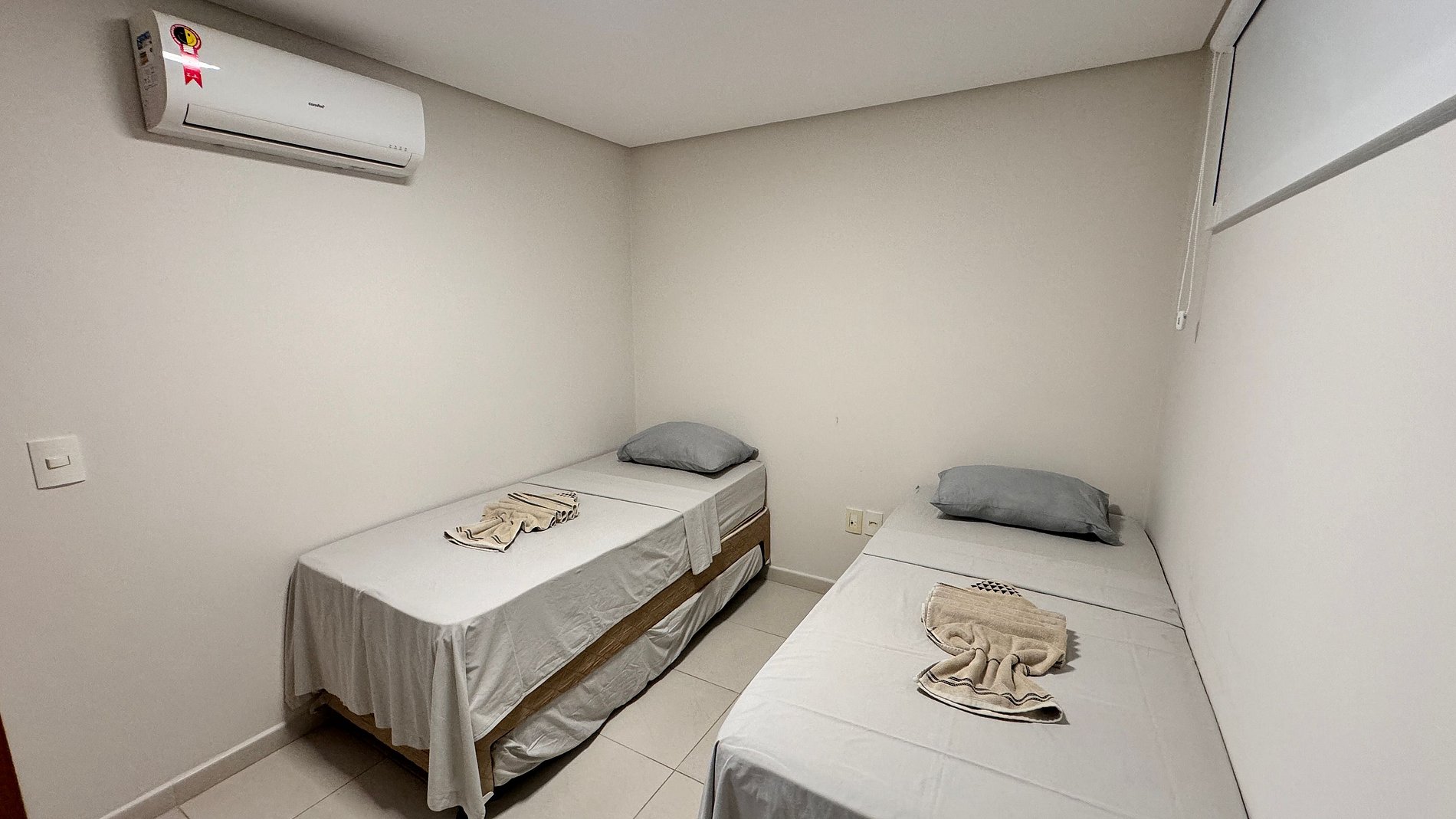Apartamento 2 quartos; acomoda até 8 pessoas confortavelmente. 1º quarto: suíte com cama casal + 2 bicamas; 2º quarto: 2 Camas solteiro + 2 bicamas; 1 banheiro social; Ar condicionado split em todos os quartos e sala, TV na sala e na suíte; Cozinha completa: Geladeira, fogão, microondas, liquidificador, sanduicheira; Enxoval completo: lençol, toalha, travesseiros, tudo para que você tenha uma excelente estadia.