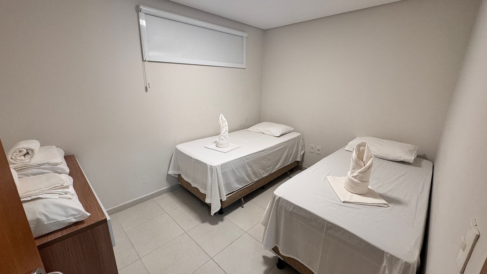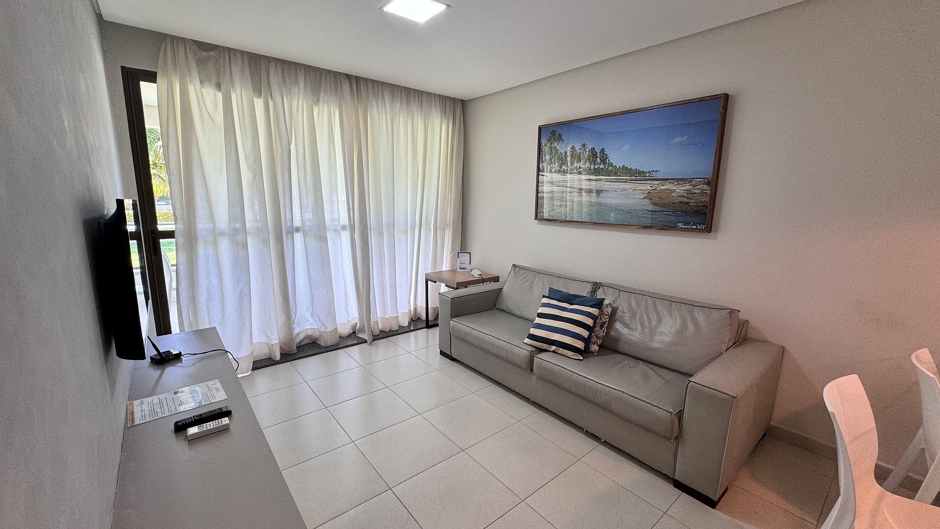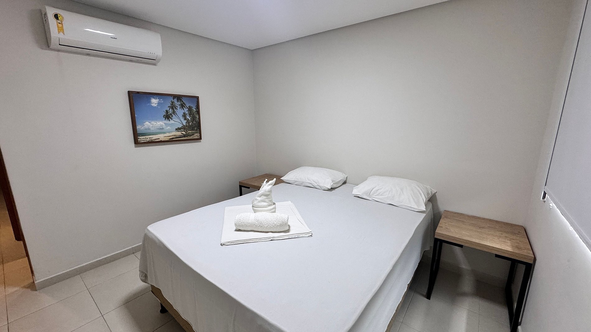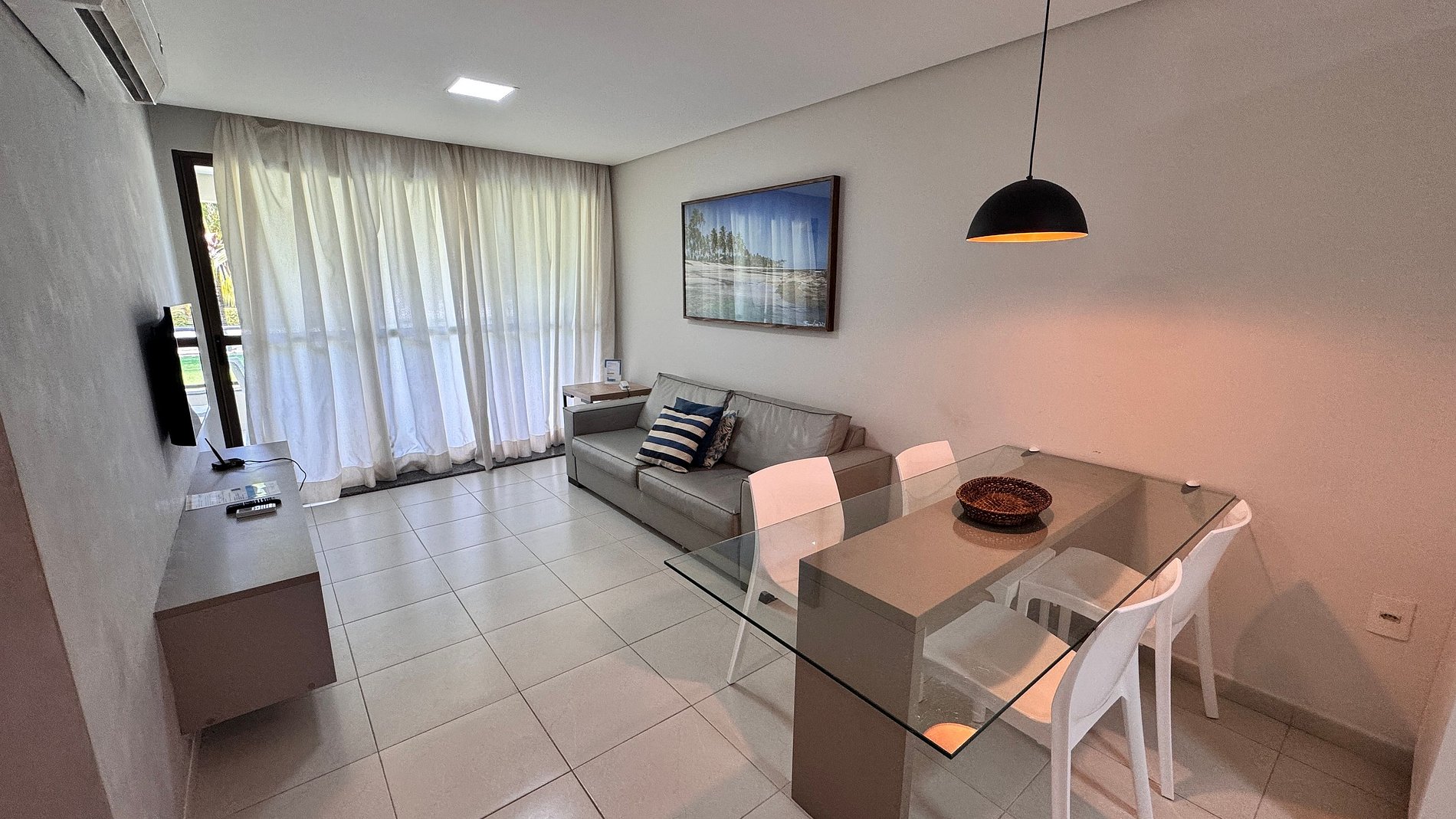 Apartamento 2 quartos; acomoda até 8 pessoas confortável. 1º quarto: suíte com cama casal + 2 bicama; 2º quarto: 2 Camas solteiro + 2 bicamas; 1 banheiro social; Ar condicionado split em todos os quartos e sala, TV na sala e na suíte; Cozinha completa: Geladeira, fogão, microondas, liquidificador, sanduicheira; Enxoval completo: lençol, toalha, travesseiros. O apartamento está localizado no Carneiros Beach Resort. Empreendimento com parque aquático, salão de festas, quadra de tênis, quadra poliesportiva, quadra de squash, a beira mar da Praia dos Carneiros, a 900m do Pontal.